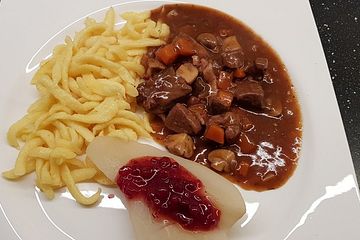 Feines Hirschgulasch Mit Serviettenknodel Und Birnenkompott Hirschgulasch Rezept Einfach