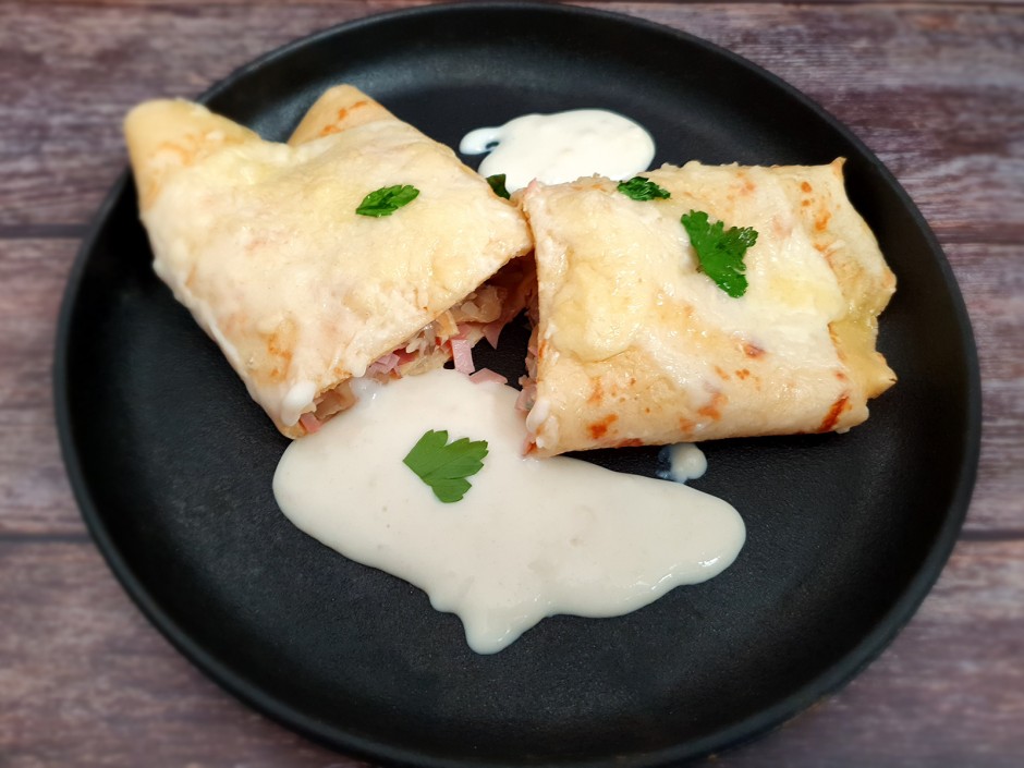 Gefullte Pfannkuchen Mit Huhnchen Und Kasesauce Koch Mit Rezept Gefuellte Pfannkuchen Ueberbacken